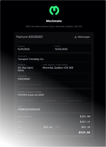 Générez des factures complètes avec main-d'œuvre, pièces et services. Suivez les paiements, gérez les relances et maintenez une comptabilité à jour.